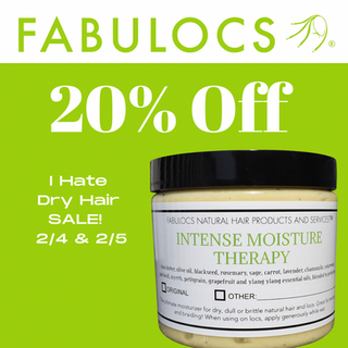 The “I Hate Dry Hair” SALE is right around the corner! This Friday and Saturday (2/4-2/5) enjoy 20% OFF of the most moisturizing moisturizer for dry prone natural hair and locs. Need product recommendations? Complete a consultation form at www.fabulocs.com . We will review and advise for FREE!